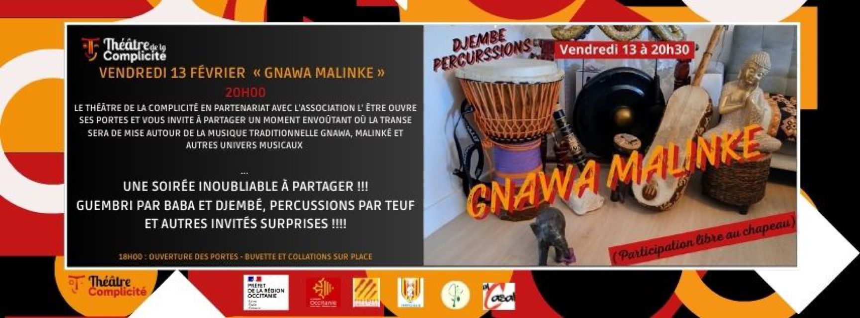 Le Théâtre de la Complicité en partenariat avec l'association L' Êttre ouvre ses portes et vous invite à partager un moment envoûtant où la Transe sera de mise autour de la musique traditionnelle Gnawa, Malinké et autres univers musicaux... Une soirée inoubliable à partager !!!